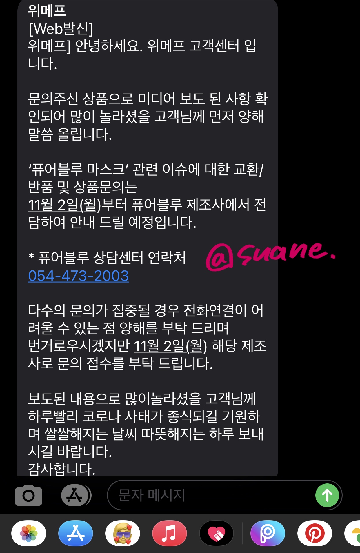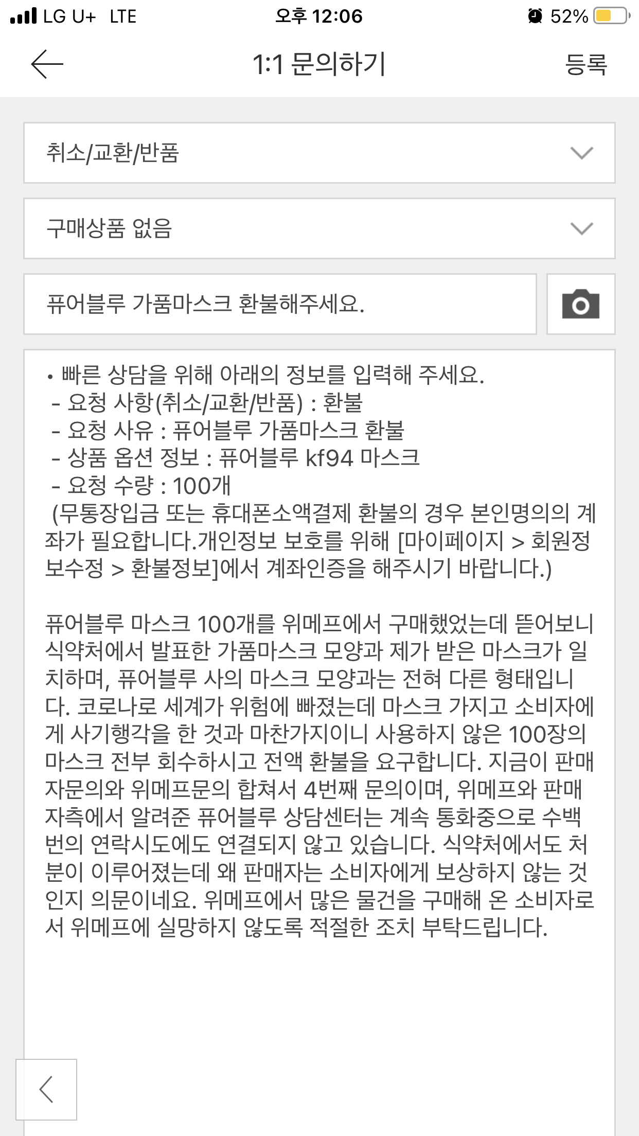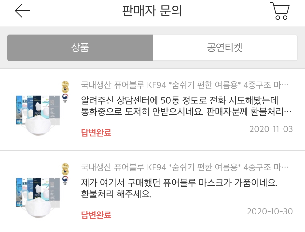 = 위메프 상담 내용 “원래 보내줬던, 가짜 마스크라고 하는 그 마스크 또한 모양만 다르지 진품이며 그래도 고객님이 찝찝하실 수 있으니 새 마스크로 교환 처리해주겠다. 해당 마스크는 가품이 아니며, 마스크 특성상 가격 변동 때문에 환불처리는 불가.”