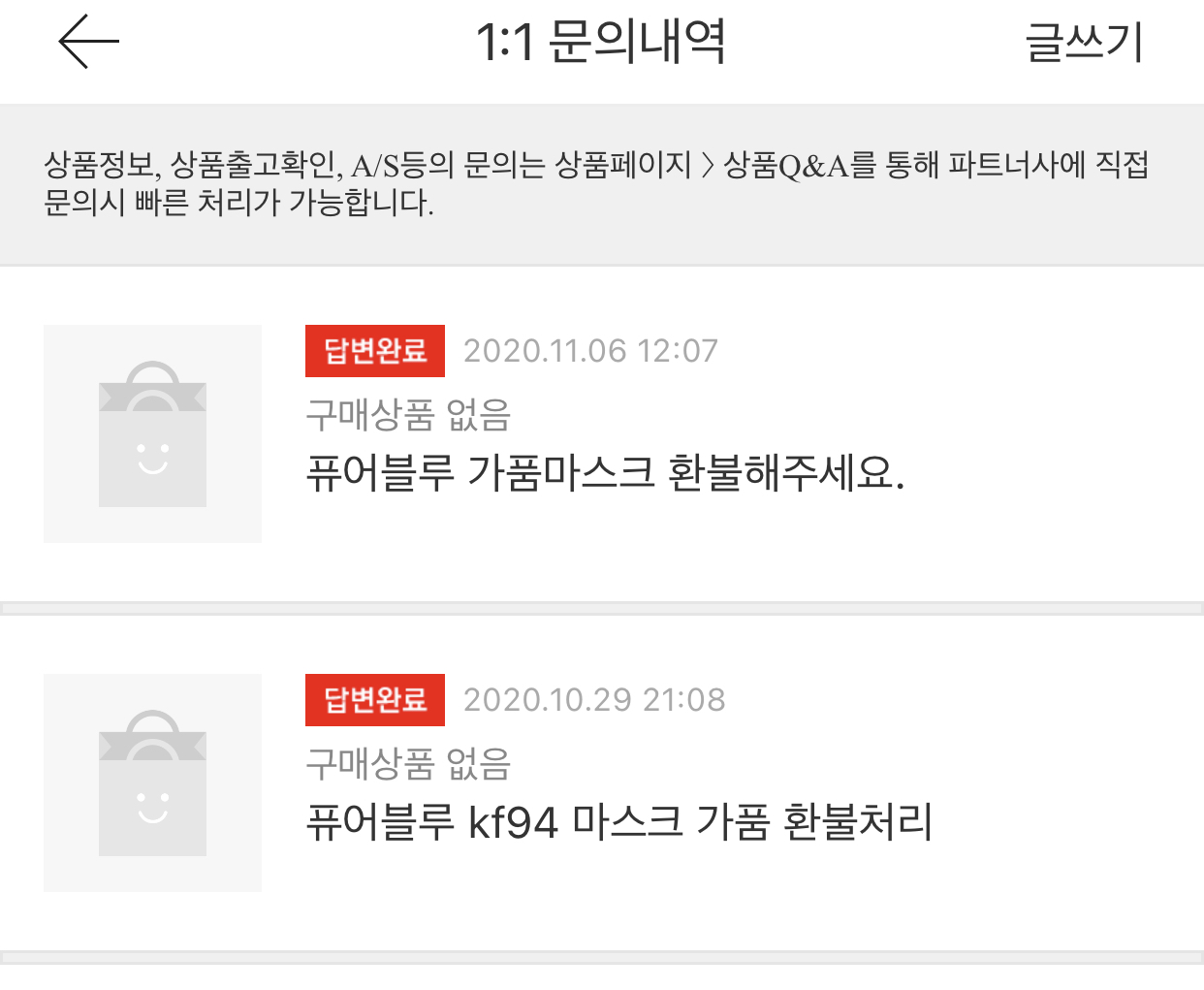 저는 위메프에서 구매했었고, 당시 마스크 값이 금값이었던 시기라 특가딜로 뜬 상품을 구매한 것이었습니다. 그래서 당장 위메프에 문의를 넣고 답변을 받았습니다.