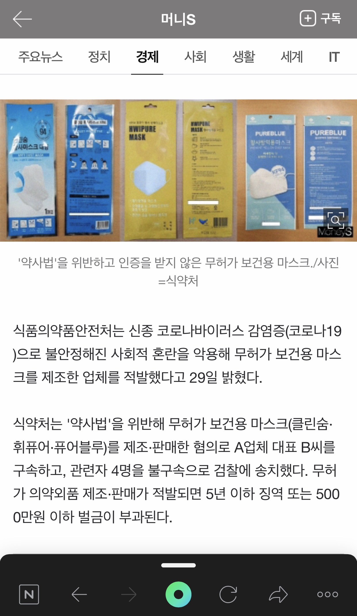 밥먹으면서 뉴스를 보는데 제가 몇 달전 사다 둔 마스크가 뉴스 메인에 뜨고 ‘식약처 무허가 마스크 판매 적발’과 같은 내용의 기사들이 가득했습니다. 분명 상품 상세정보에 식약처 인증 마크와 문서가 첨부되어 있었기에 의심할 여지 없이 구매했었던 터라 실망감이 말로 표현할 수 없을 정도였습니다. 혹시나 하고 한개를 뜯어보니 역시나 제가 구매했던 마스크도 가짜마스크 였습니다.