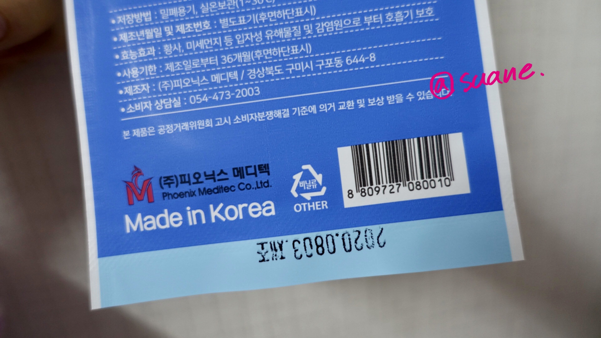 제조일자와 사용일자 마크. 이 날짜 마크가 가품에는 한 줄이었고, 진품은 이렇게 두 줄로 찍혀있다고 합니다. 제가 받은 가짜마스크와 진품마스크도 이와 같은 차이를 보여주고 있었습니다. 시간은 오래 걸렸지만 다행히 교환처리를 수월하게 해줬고 저도 제대로 된 상품을 받을 수 있었습니다.